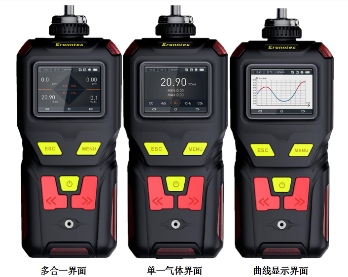 ●三種顯示模式可切換:同時(shí)顯示四種氣體濃度、大字體循環(huán)顯示單通道氣體的濃度、實(shí)時(shí)曲線,各通道之間自動循環(huán)或手動循環(huán)可切換,可設(shè)置是否顯示最大值、最小值、氣體名稱,可查看歷史記錄曲線圖。