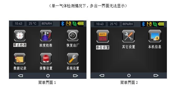 ●2.31英寸高清彩屏顯示實(shí)時(shí)濃度、報(bào)警、時(shí)間、溫度、濕度、存儲、通信、電量、充電狀態(tài)等信息,菜單界面采用高清仿真圖標(biāo)顯示各個菜單的功能名稱